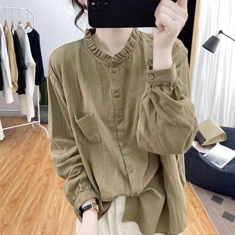 Long Sleeve Shirt Women's Spring Autumn Solid Color Vintage Loose Fit Fashionable Versatile Slimming Underwear Outer