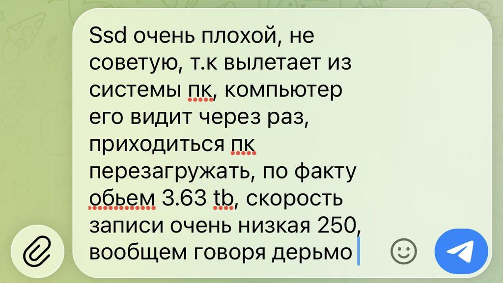Ordered 5 pieces, all 5 have a speed many times slower than stated, the disk memory capacity shows 3.63 TB out of 4 TB. Also, the state of the memory blocks is <20 MB/sec