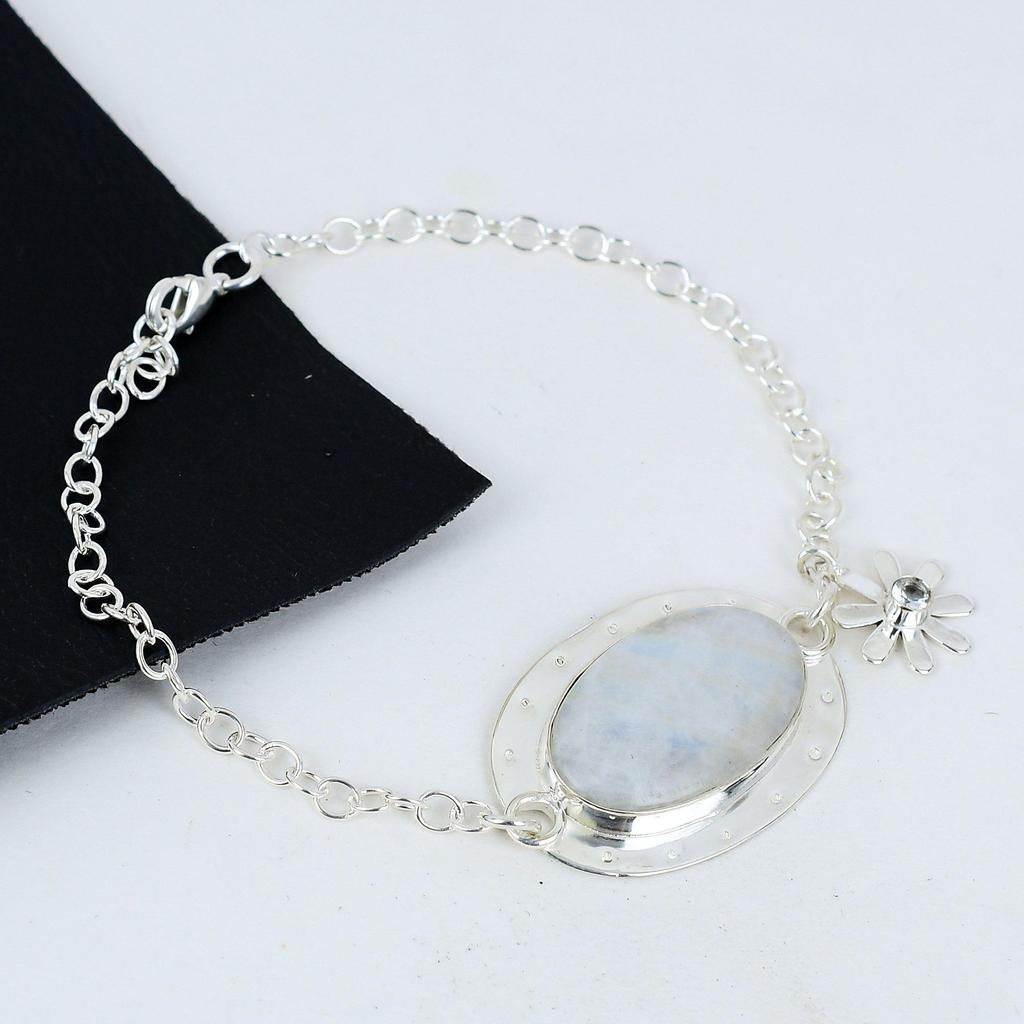 Natural Rainbow Moonstone Gemstone Handmade 925 Sterling Silver Bracelet, White Topaz Bracelet For Wife, Unisex Bracelet, Anniversary Gift