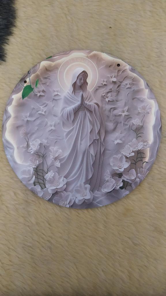 3D Maria Sculpture Wooden Poster Board, 8 Inch Religious Round Wall Art with Garland, Floating Statue Design for Home