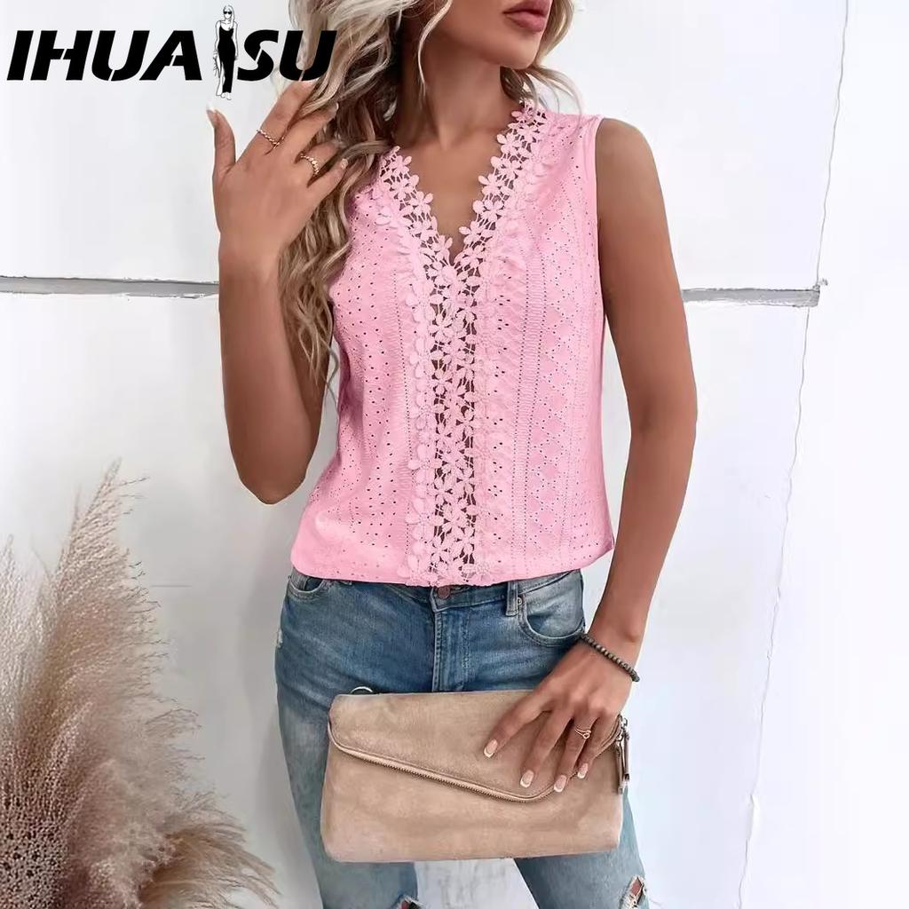 IHUASU Women's Summer V-neck Splicing Cutout Lace Vest T Top Women
