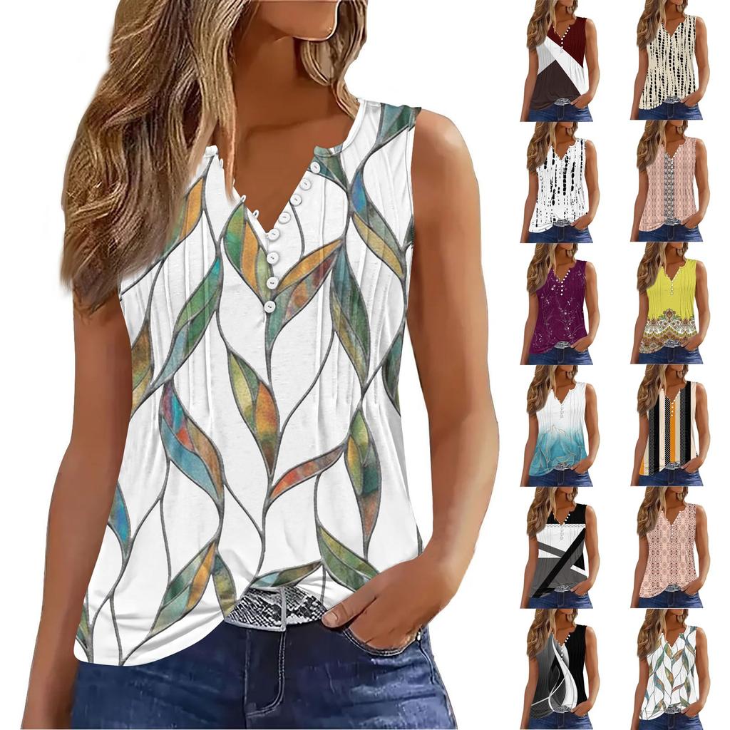 Women's Flowers And Plants Casual Loose Pleated Shirt V Collar Button-down T-shirt Shirt Sleeveless Vest Top
