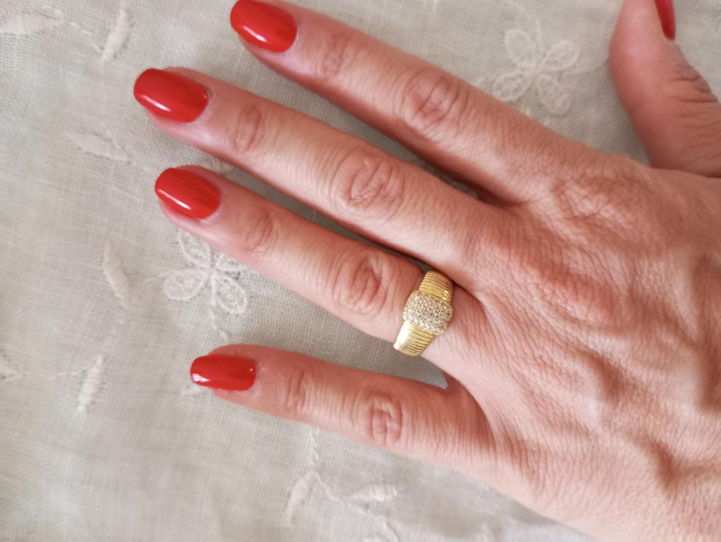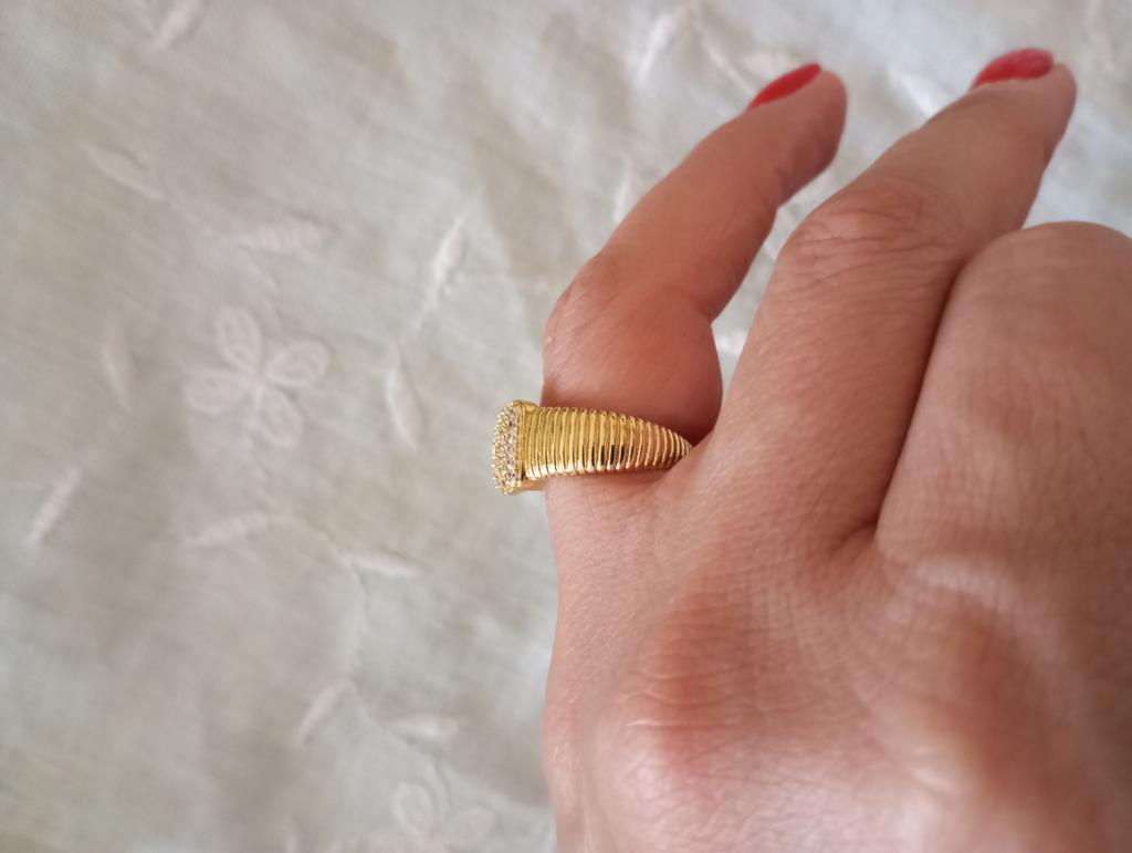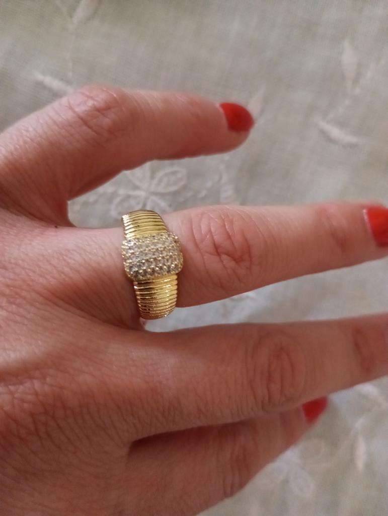 The ring looks great, the model is modern. The yellow gold plating looks like gold. All the stones are in place. I recommend it.