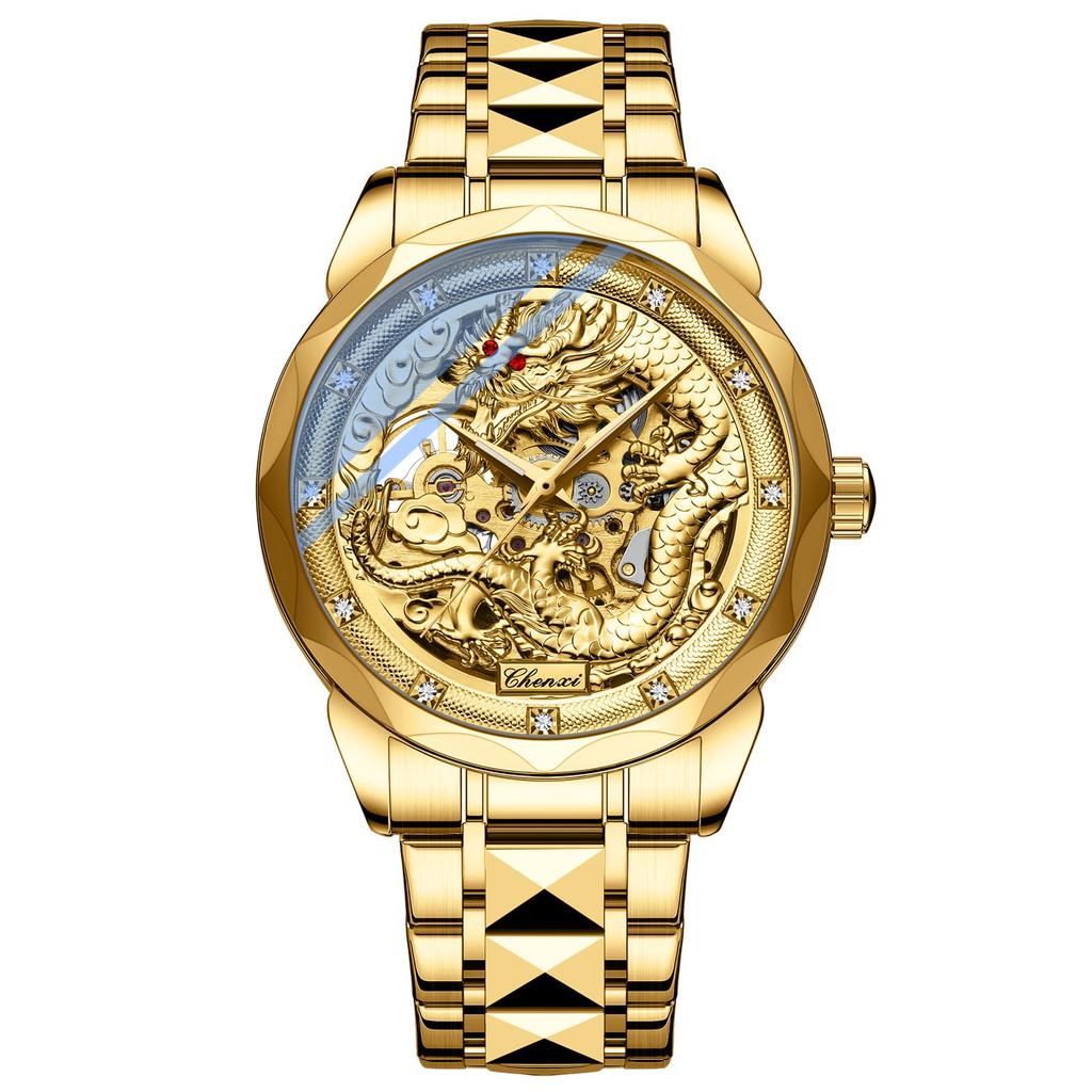 Gold 3D Dragon Dial Watches for Men Luxury Automatic Mechanical Watch Stainless Steel Strap Hollow-carved Wristwatches
