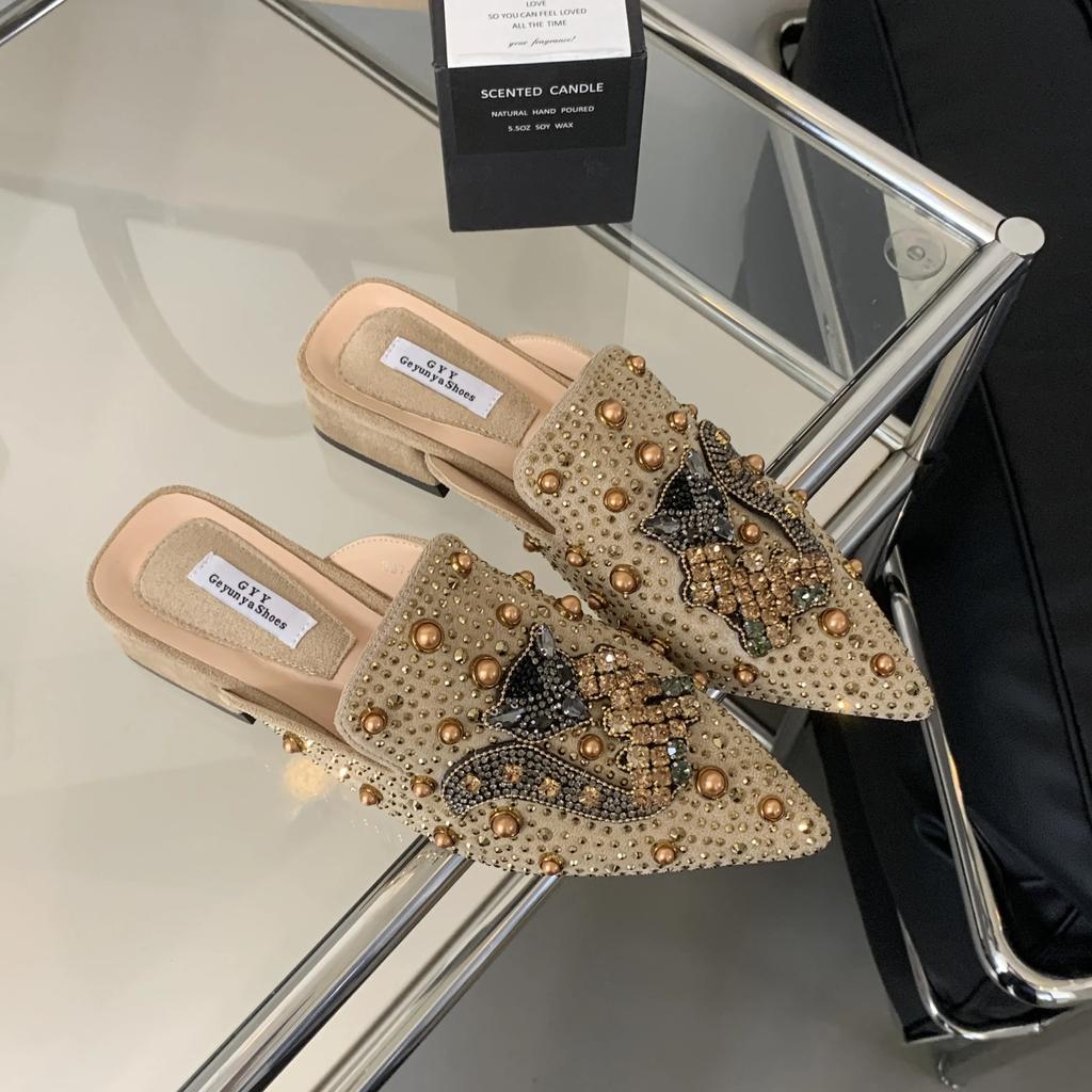 Summer Suede Rivets Rhinestone Fox Ladies Slippers Women Luxury Designer Shoes Comfortable Slippers Sandals Mules