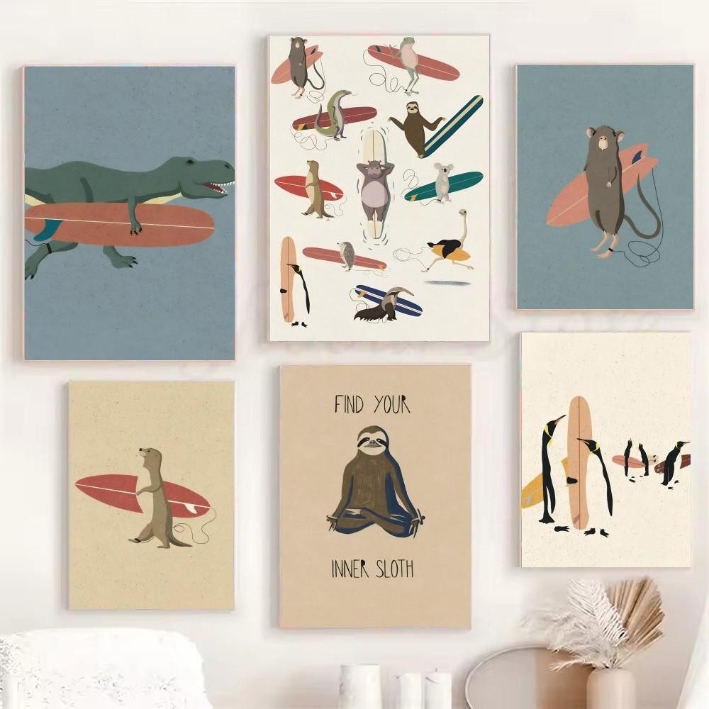 1pc Surfing Animals Vintage Cartoon Sloth Frog Racoon Zebra Poster HD Posters Home Room Bar Cafe Decor Art Wall Painting Picture