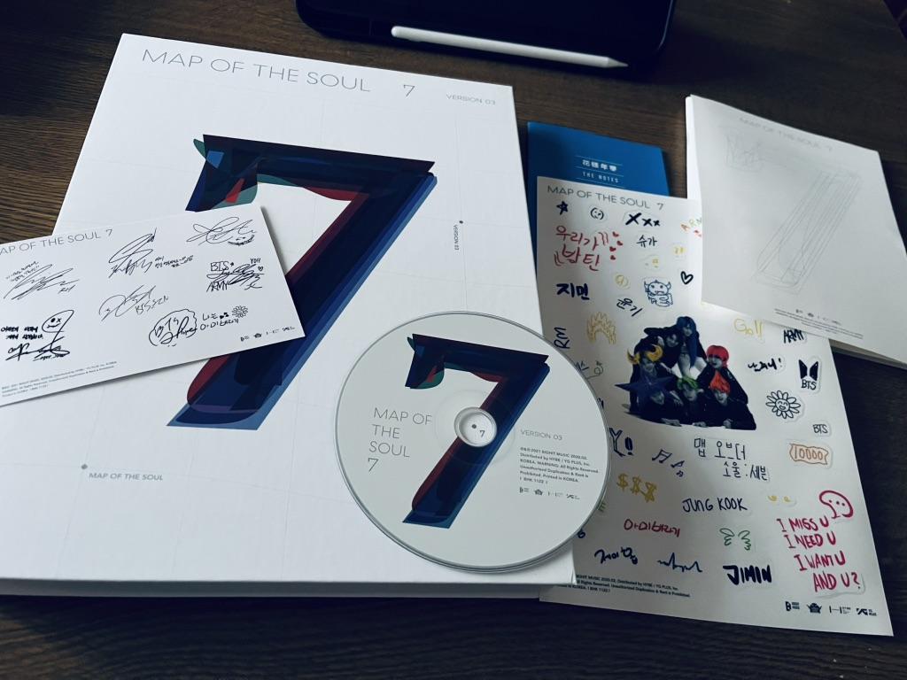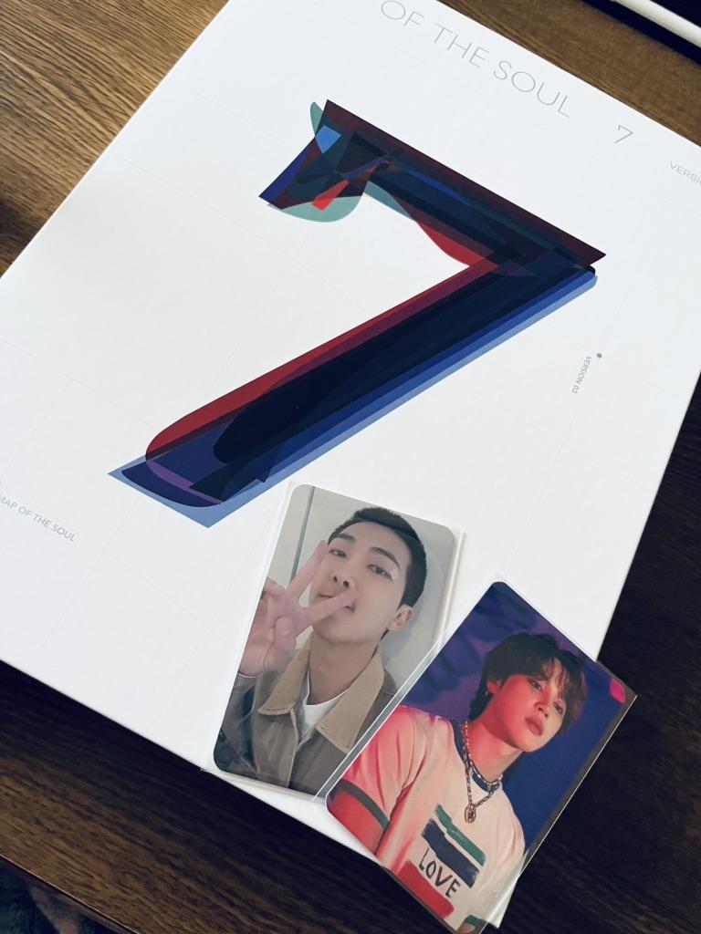 The album arrived in very good condition. 💛 I have a special love for Map of the soul 7💜 Thank you to the seller for the two photocards 🥰🤗💜 Although my bias is Jimin, I was happy to get photos of Hobi 🥰 V and JK (already a gift). A heartfelt purchase and a dream come true. Thank you so much 💜🥰🤗🎁