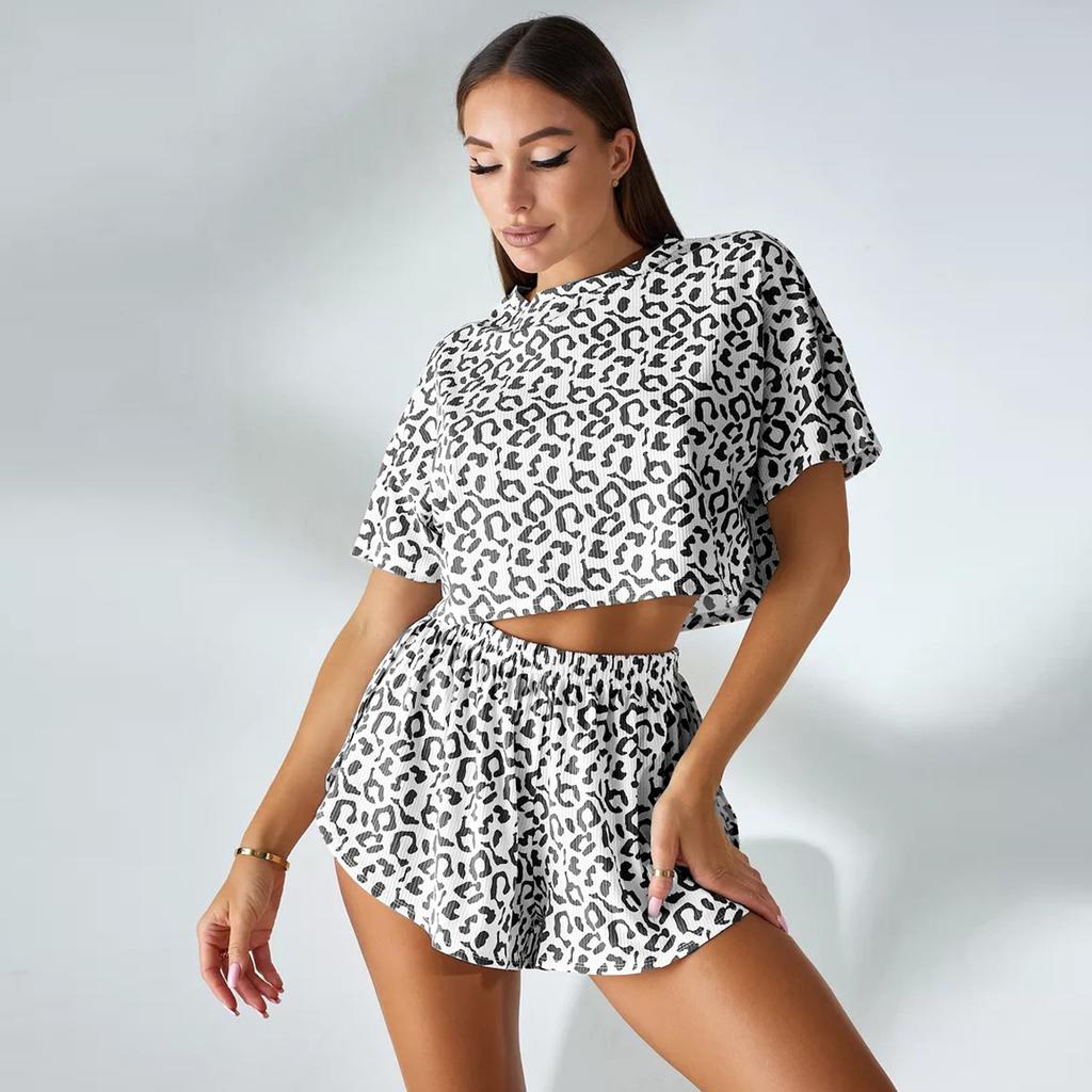 Summer Leopard Printing Thin Pajamas Set for Women Homewear Sexy Loose Short Sleeve Crop Tops and Shorts 2 Pieces Sets Sleepwear