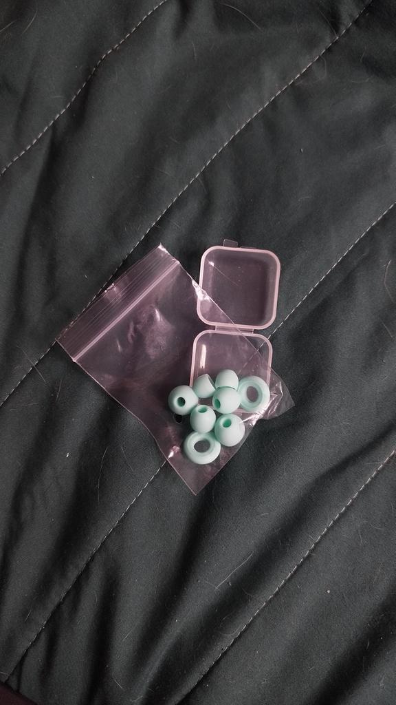 The set includes 3 sizes of earplugs. One is torn. None of the sizes fit. They fall out of the ears.