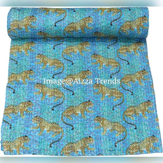 Aizza Trends Handmade Pure Cotton Tiger Print Kantha Quilt - Traditional Look Bed Spread Kantha Gudri - Vintage Hand Stitch Gudri