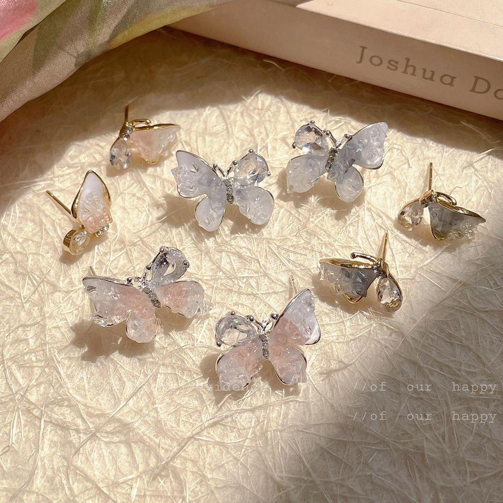 Summer Peach & Mist Blue Crystal Butterfly Earrings - Elegant Silver Needle Design for Women