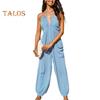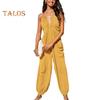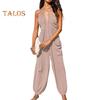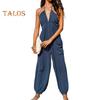 Women's Halter Maxi Jumpsuit Pleated Deep V Neck One Piece Jogger Long Pants with Pockets Casual Beach Sleeveless Rompers