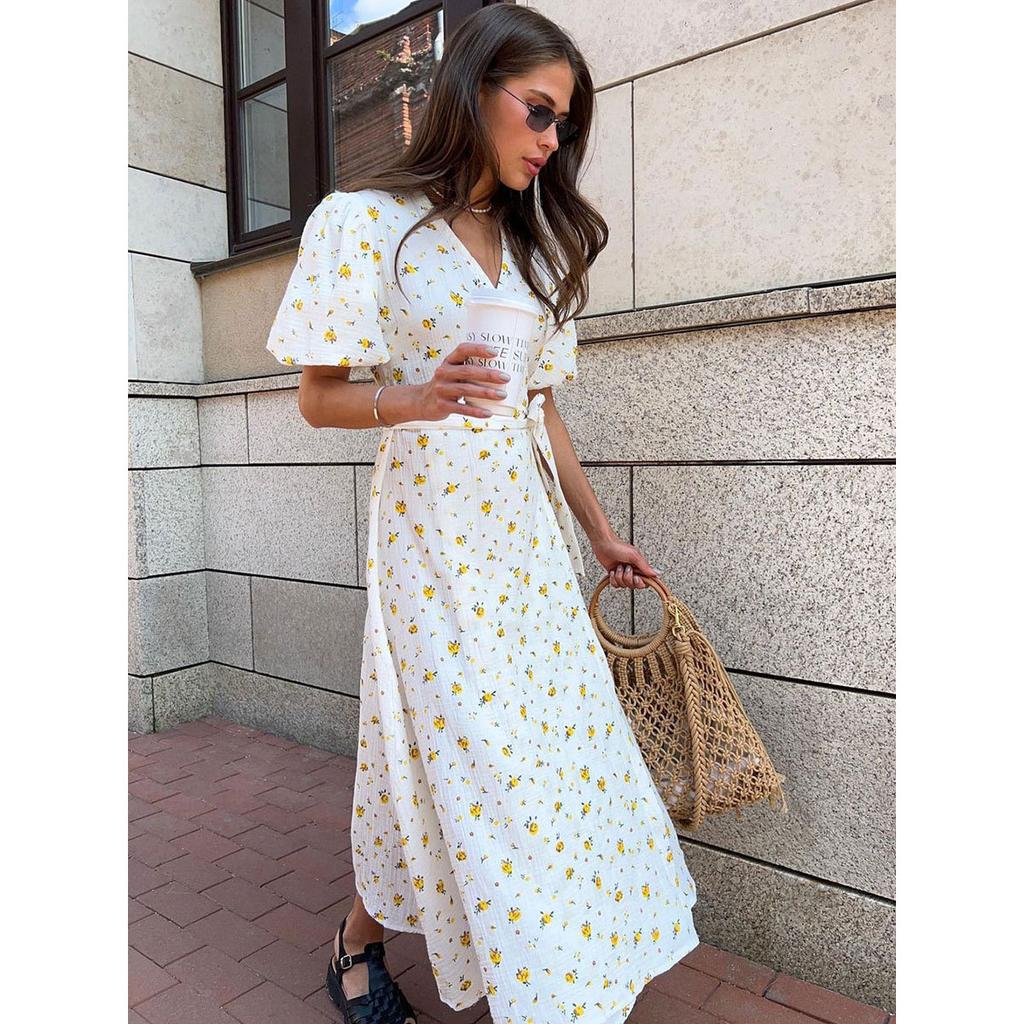 Casual Women's Summer Dresses Cotton Floral Print A-line Midi Dress with Side Slits Long Elegant White Dress for Women