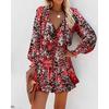 IHUASU Spring Summer Long Sleeve V-neck Fashion Print Waist Dress for Women