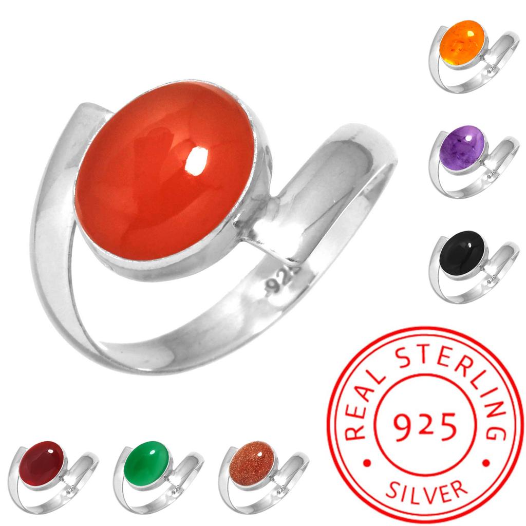 925 Sterling Silver Ring Women Gemstone Handmade Jewelry Engagement Gift Amber Amethyst Black Onyx Carnelian Garnet Quartz Green Onyx Gold Stone