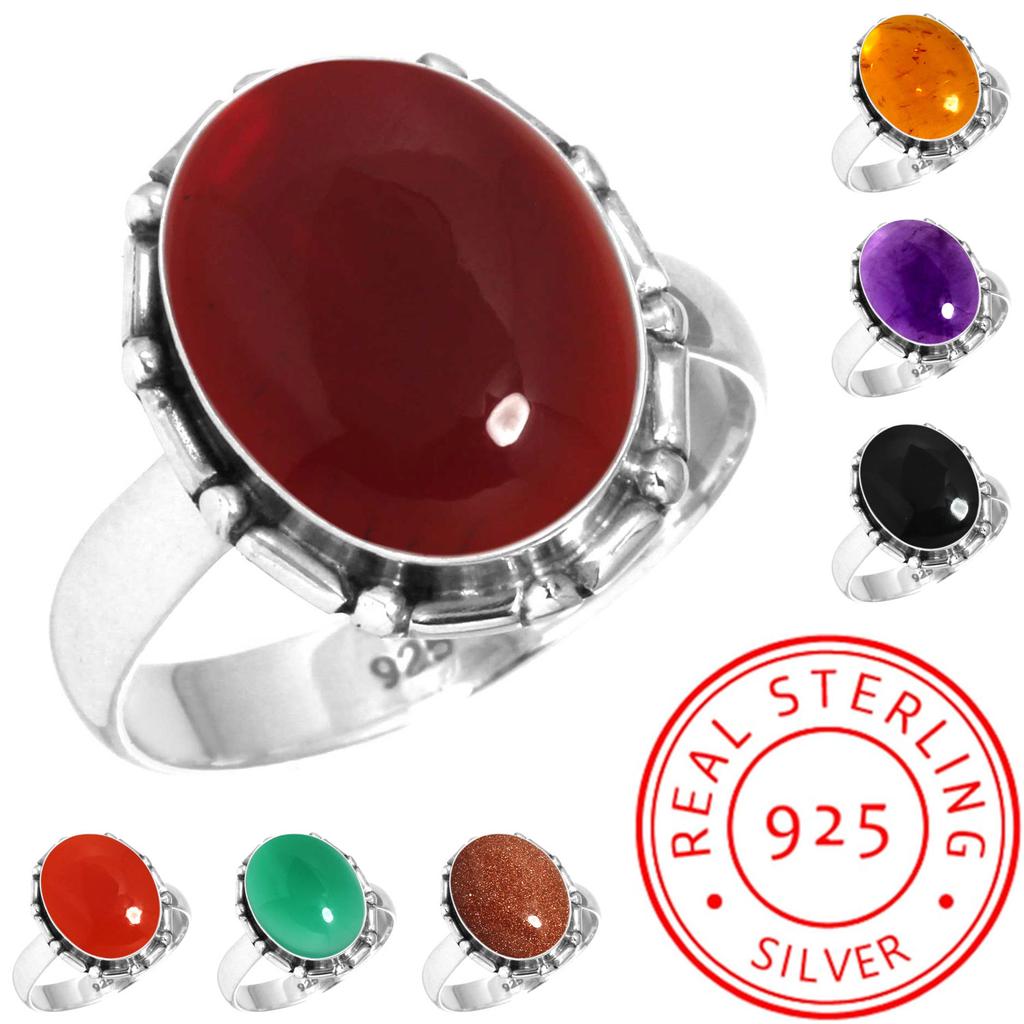 925 Sterling Silver Ring Women Gemstone Handmade Jewelry Valentine's Day Gift Amber Amethyst Black Onyx Carnelian Garnet Quartz Green Onyx Gold Stone