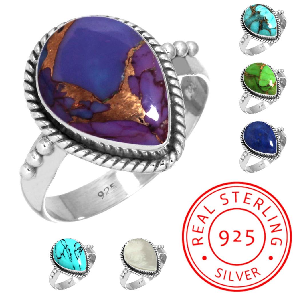 925 Sterling Silver Ring Women Gemstone Handmade Jewelry Thanksgiving Gift Blue Green Purple Copper Turquoise Pearl Lapis Mother Of Pearl Statement