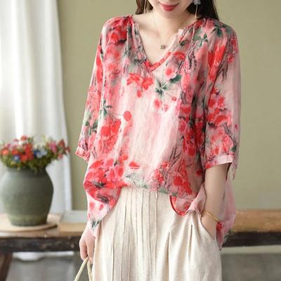 Summer Shirt Vintage Floral Print Tops Women V Neck Leisure Chic Loose Blouses Cotton Linen Thin Half Sleeve Shirts Lady