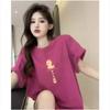 Spring and Summer Pure Cotton Short-sleeved Wine Red Peaceful Printed Loose Versatile T-shirt Top for Women