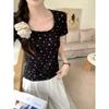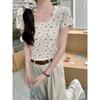 All-match Square Collar Front Shoulder Floral Short-sleeved Shirt Lace Slim Summer Slim Base Short Top