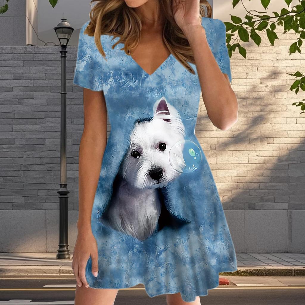 Summer Fashion Women's V Neck Short Sleeve Cute Puppy Printed Dress Sex Short Skirt Dresses