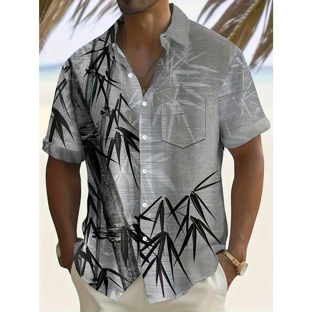 Men's Tropical Bamboo Patterned Short Sleeved Shirt, Casual Summer Button Up Top with Chest Pocket