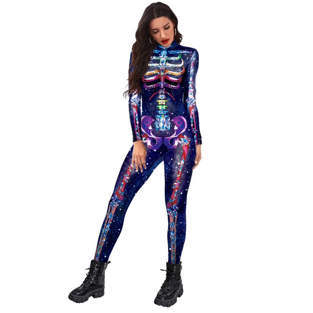 Horror Purple Skull Print Bodysuit Day Of The Dead Halloween Party Role Playing Set Adult Bodysuit Carnival Costume