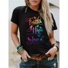 Plus Size Casual T-shirt Women's Plus Butterfly & Slogan Print Short Sleeve Round Neck Slight Stretch T-shirt