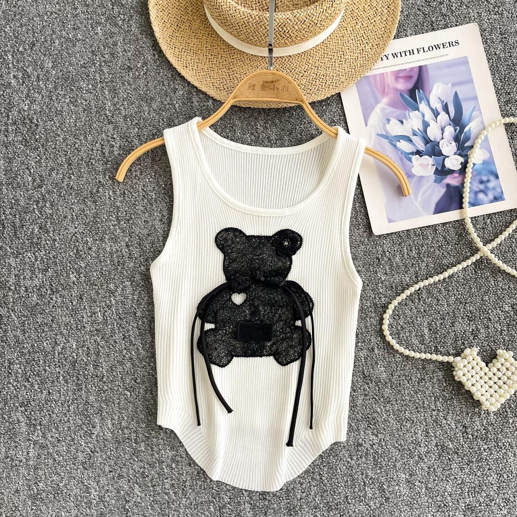 Summer Women Chic Sleeveless Cartoon Knitted Sweater Short Pullover Vest for College Girl
