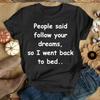 Summer Short Sleeved Cute T Shirts Funny Saying Graphic "PEOPLE SAID FOLLOW YOUR DREAMS,SO I WENT BACK TO BED..." Round Neck Tee