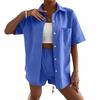 IHUASU Cotton and Linen Fashion Set, Solid-color Pocket Patch Off-the-shoulder Shirt and Shorts, Solid-color Short-sleeved Shirt