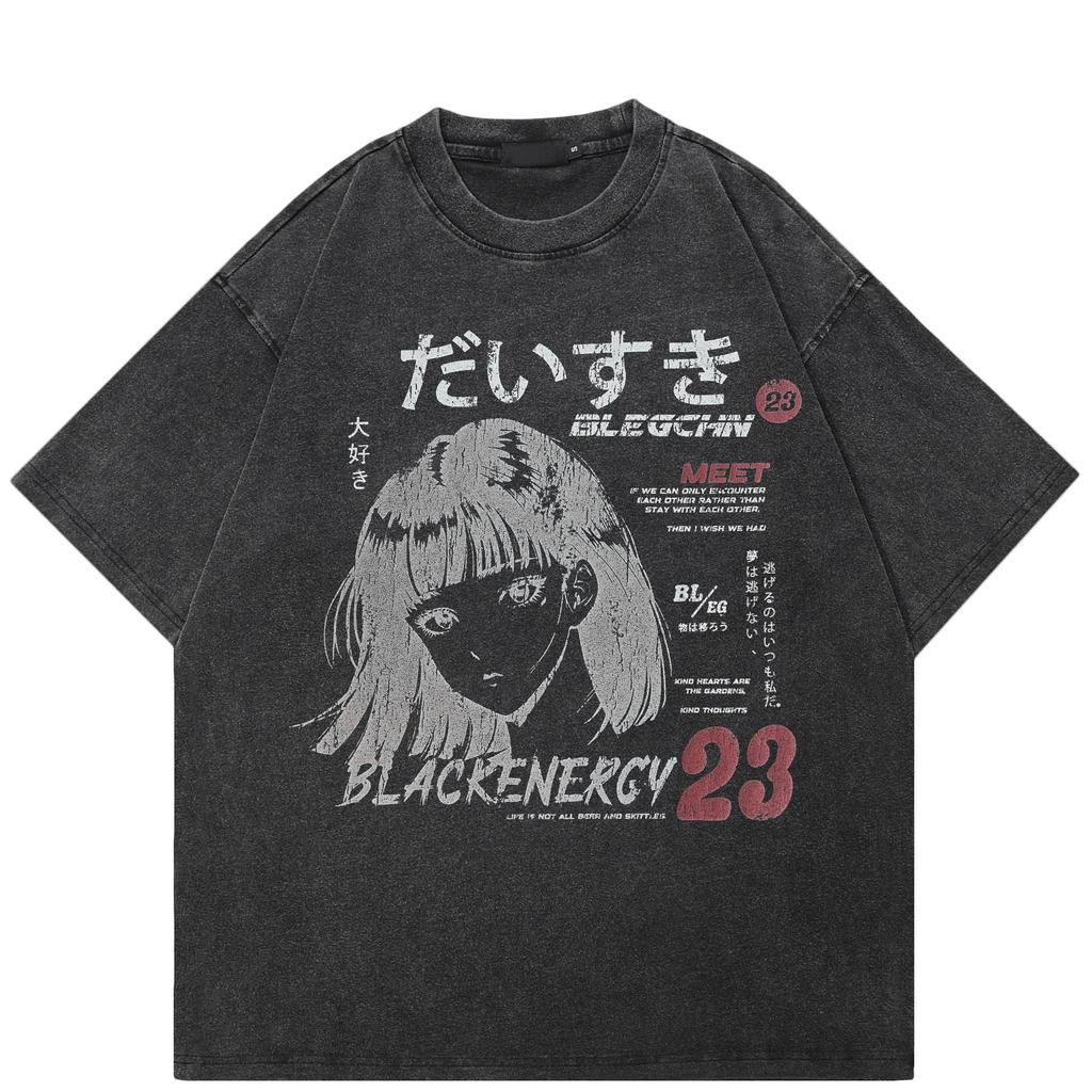 Streetwear Anime Girl Graphic T-Shirt Cotton Washed Black Tshirt Unisex Tops Tees Summer Short Sleeves T Shirt