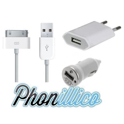 3-in-1 Charger Pack - Phonillico - Compatible iPhone 4S - Wall Charger - Car Charger - 1m USB Cable