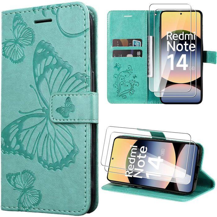 Protective Case - E.F.Connection - for Xiaomi Redmi Note 14 5G - Butterfly Pattern - PU Leather - Green - 2 Tempered Glass