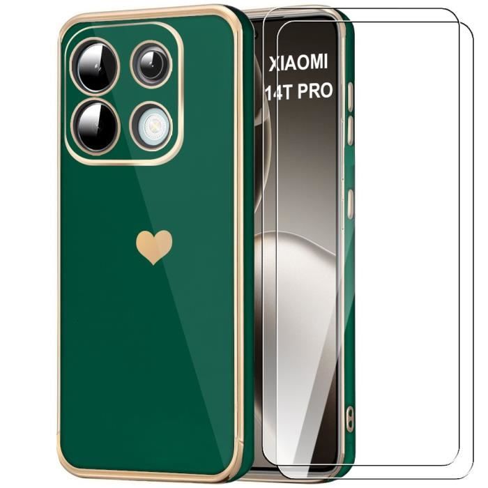 Case and Tempered Glass - Xiaomi - 14T Pro - Flexible TPU - Night Green - Heart Pattern
