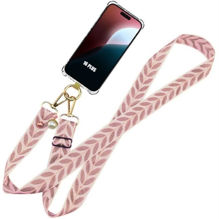 Case for iPhone 16 Plus - Silicone - Transparent - Adjustable Cord - Shockproof - Pink