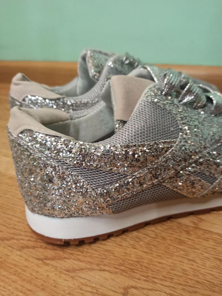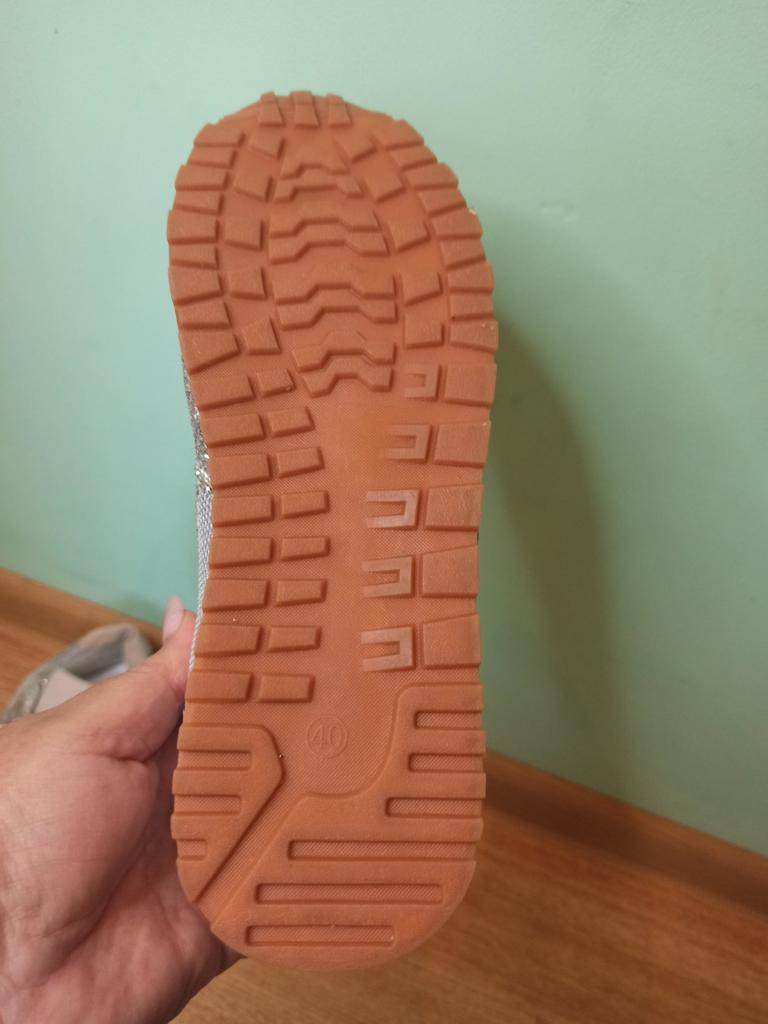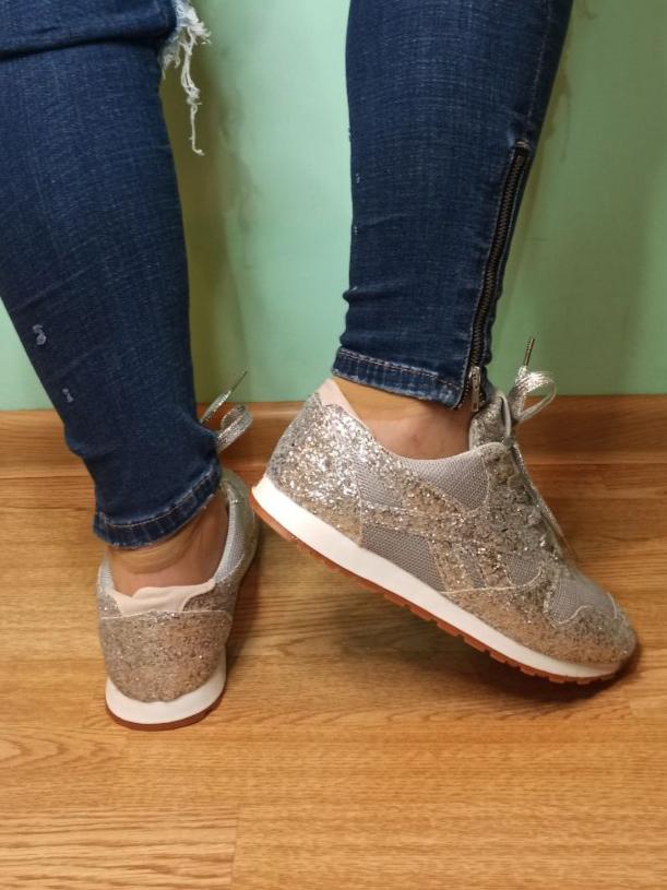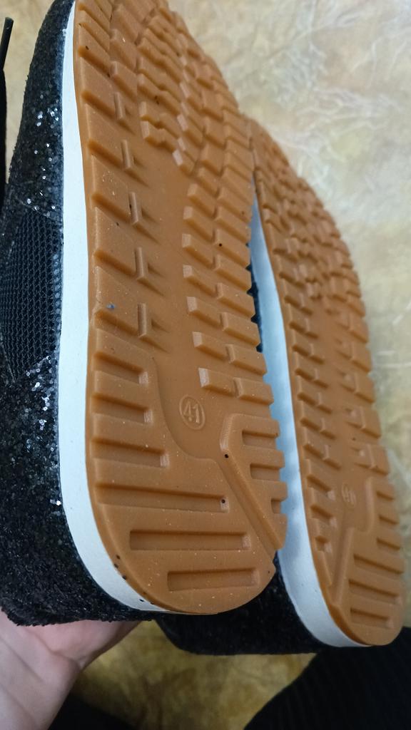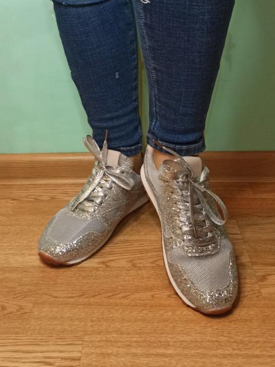 Sneakers with glitter. Overall not bad, for the money, the glitter doesn't shed, it holds on firmly, but the sneakers rustle a bit when they rub against each other. To size : On daughter 38 Size. Her foot is 23 cm Details: Insole 23.5 cm Platform 4/1 cm