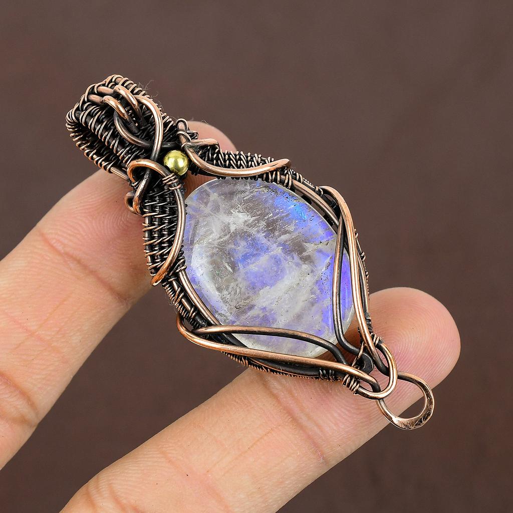 Rainbow Moonstone Handmade Copper Wire Wrap Pendant Jewelry 2.25" D5j71