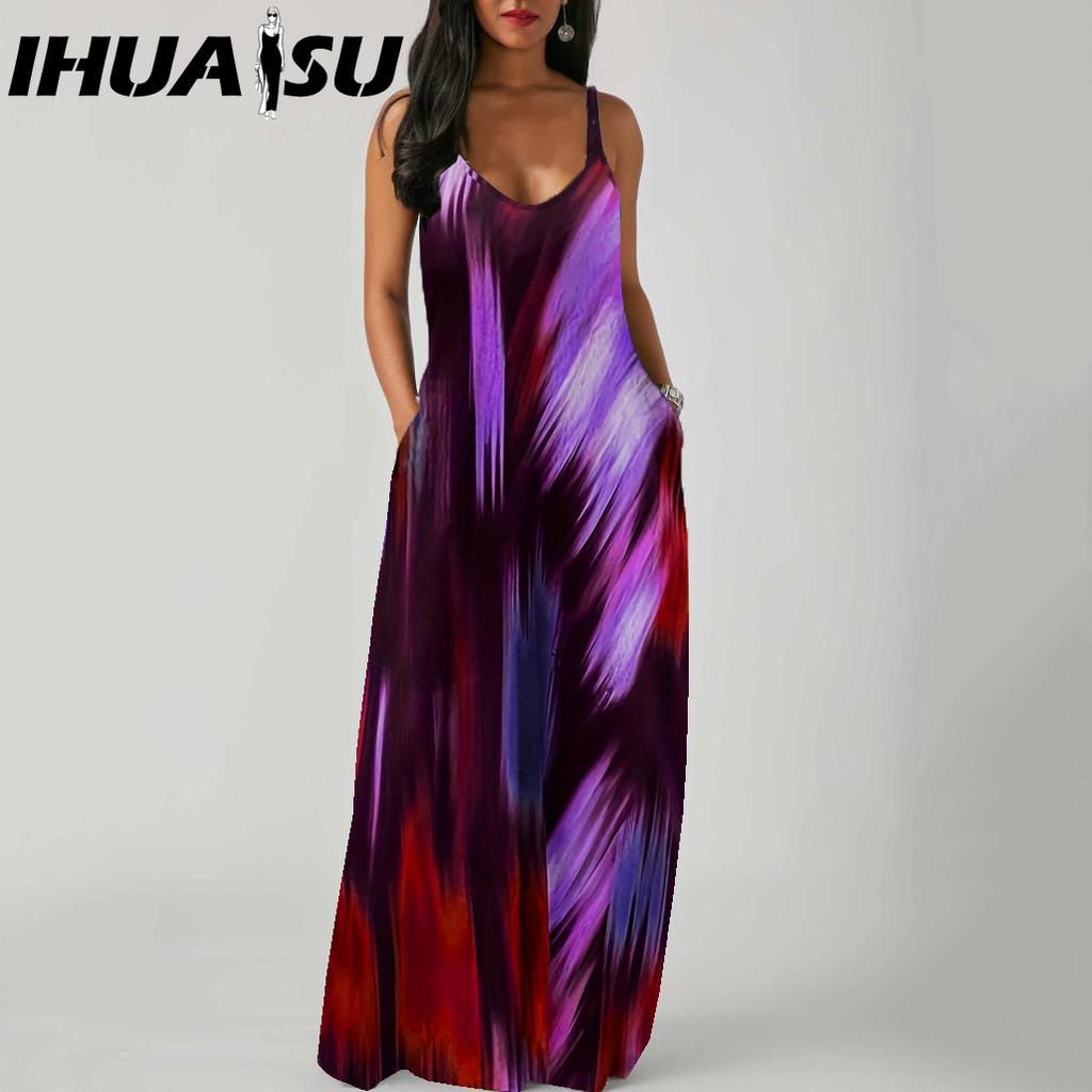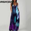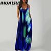 IHUASU Elegant Fashion Floor Length Sleeveless V Neck Simple Women Summer Retro Printed Loose Waist Straight Dress