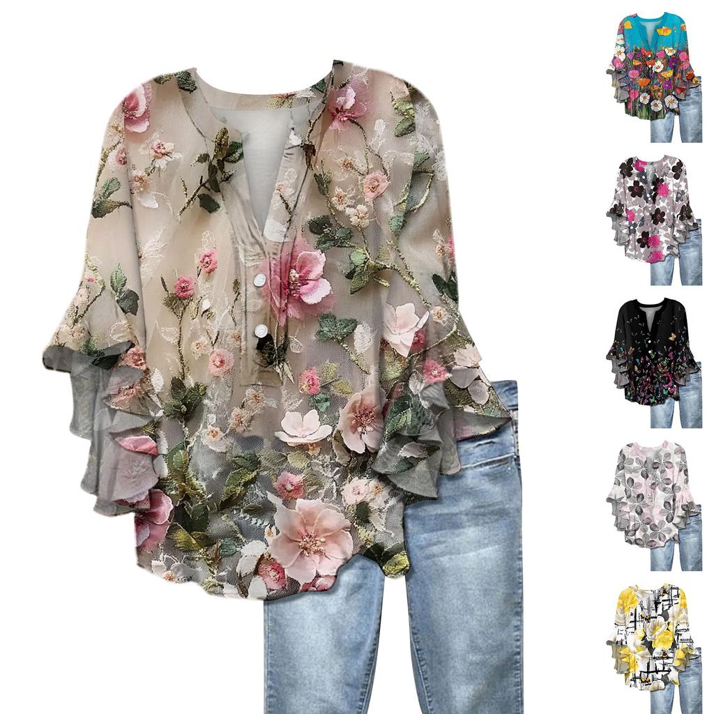 Summer Tops For Women Cute V Neck 3/4 Sleeve Blouses Floral Print Top Casual Shirts