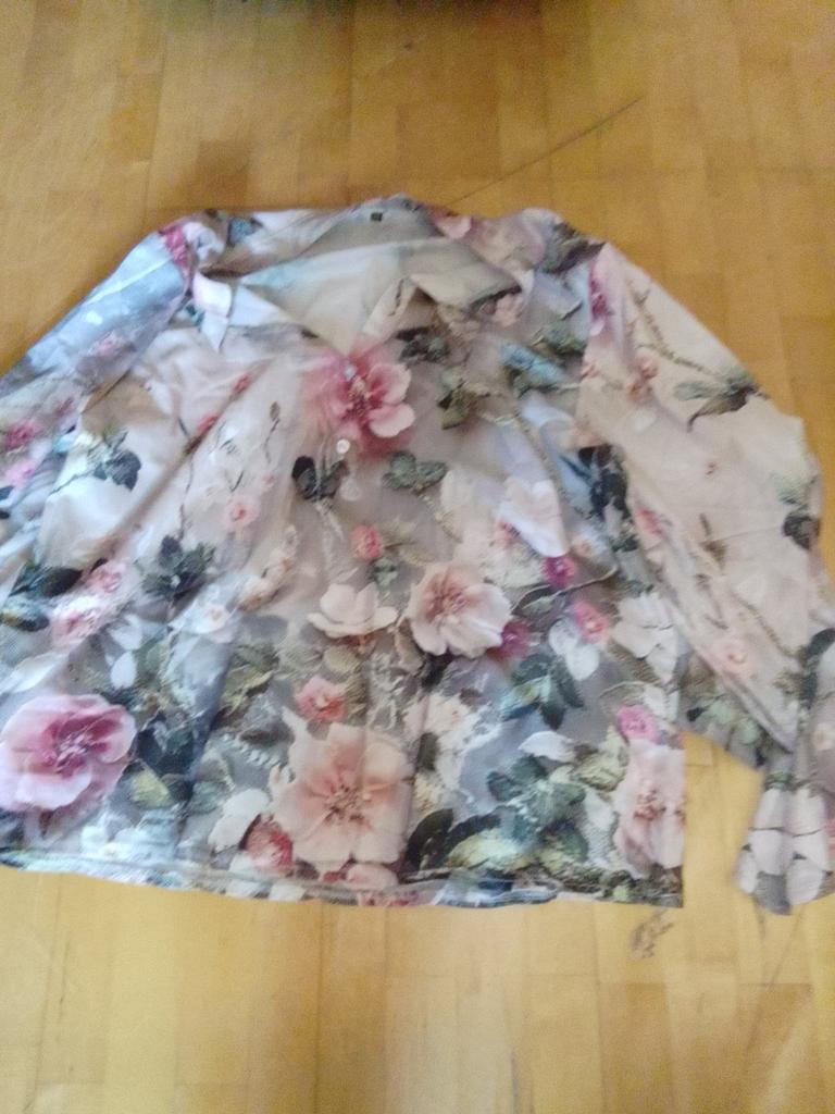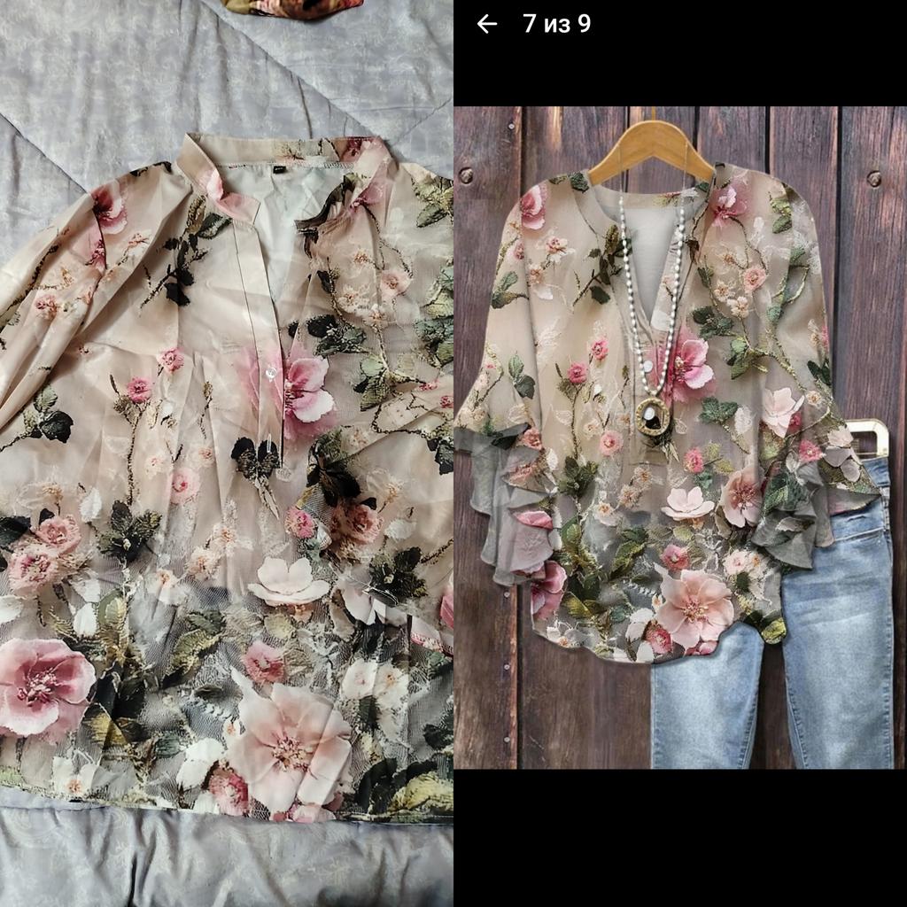 The blouse is interesting, just right for 52-54 around the bust, sleeves with a ruffle, a bit unusual - you need to get used to wearing it (with a long tail on one side). The material is good.