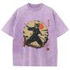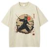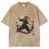 Japanese Women's T-shirt Summer Short Sleeve Washed Denim Stretch Fabric Samurai Cat Print Top Retro Wear Men