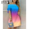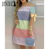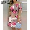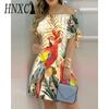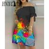 HNXC Women Fashion Off Shoulder Dress Short Sleeve Bow Tie Print Dresses Summer Beach Dresses Plus Size