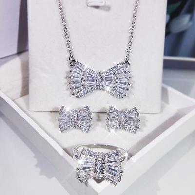 Korean Version Simple Bow Necklace Earrings Three Piece Set Platinum Plated Set with Zirconium Womens Fashion Accessories