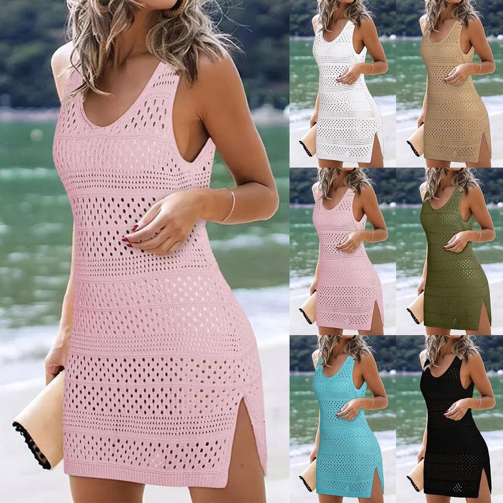 Women Swimsuit Cover Ups Dresses Cutout Beach Cover Up Sleeveless Crochet Bathing Suit Summer Beachwear Hollow Out Coverup