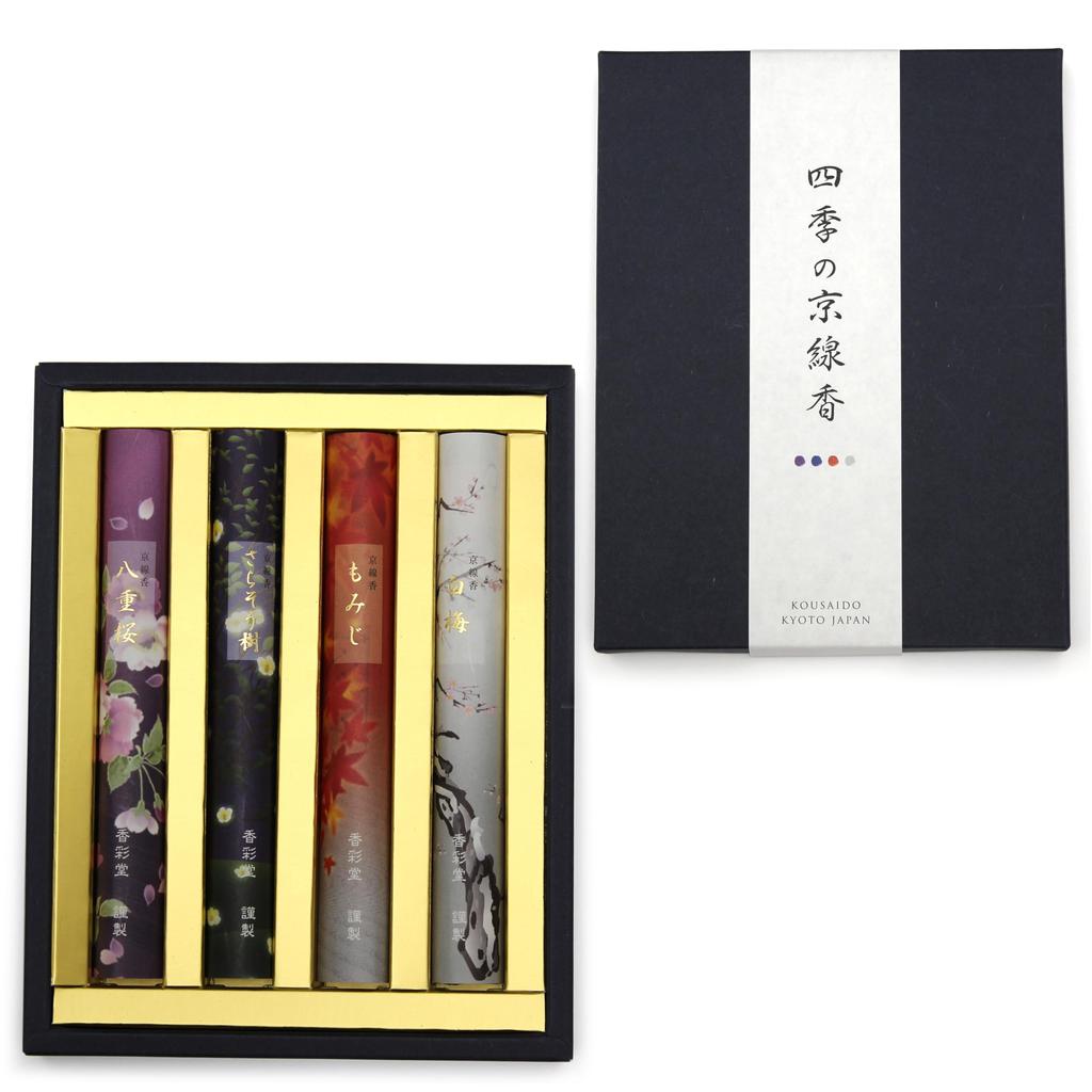[Specifications] Dimensions (exterior) mm: Approx. 180 x 140 x 22 (high) Contents: Approx. 45 bottles x 4 types Smoke amount: Small Burning time: Approx. 22 minutes Scent: 4 types of feminine, sweet, gorgeous, and spicy scents Materials: Maple (tab powder, sandalwood, vanilla, dragonfly, musk, etc.) Sala Soju (Tab flour, sandalwood, magnolia, lychee, etc.) Double cherry blossoms (Tab flour, sandalwood, raspberry, jasmine, etc.) White plum (Tab flour, sandalwood, dragon brain, clove, etc.) Country of manufacture: Kyoto