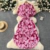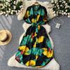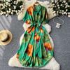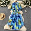 Summer Dress Retro Lantern-sleeved Women's Dress Single-breasted Cinched-waist Tie Printed Dress