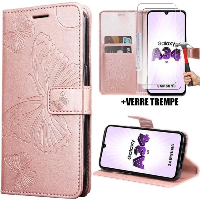 Case - BOOLING - for Samsung Galaxy A34 5G - Pink - Butterfly - Leather Effect - Shockproof - with 2 Tempered Glasses