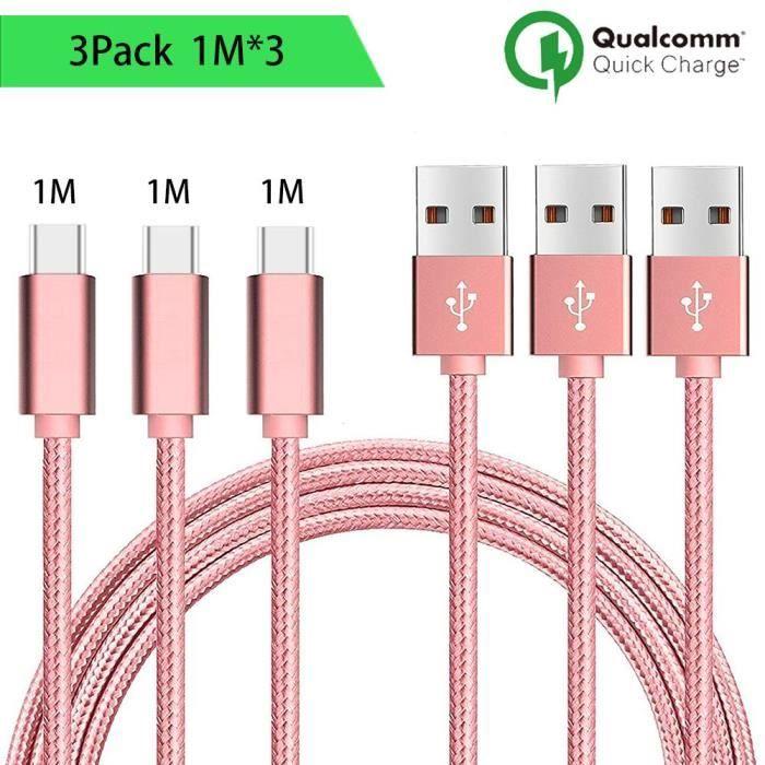 Câble USB Type C - Nylon - 1M - Compatible Samsung Galaxy et Huawei - Couleur Rose - Durable