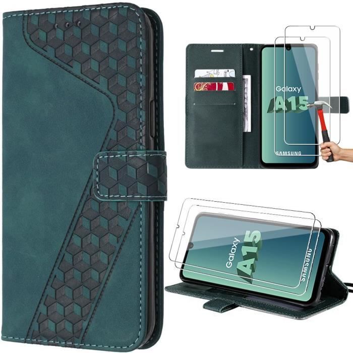 Coque de protection - BOOLING - pour Samsung Galaxy A15 5G - Cuir PU Vert - Support réglable - 2 Verres Trempés